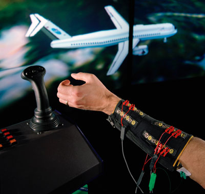 A set of electrodes records nerve signals in the arm, allowing a pilot to control a jetliner simulation without actually touching the joystick.