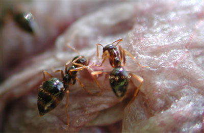 This photograph shows two ants on a decaying Rose of Sharon blossom. Ant colonies offer scientists and engineers lessons in optimization and distributed, real-time decision-making.