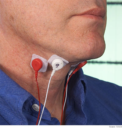These electrodes pick up nerve signals bound for the throat and tongue. The signals are then processed by a computer to identify silently spoken words and numbers.