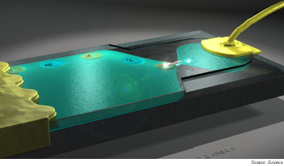 This graphic shows electrons (red dots) being emitted one and a time from a quantum dot device.