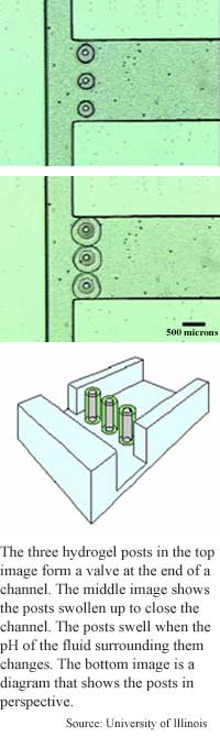 Gels make micro plumbingBy Kimberly Patch, Technology Research NewsThe obvious difficulties of fabricating very tiny machines are the limitations of human sight and dexterity. Less obvious are the way the laws of physics at very small scales, where surface forces like static electricity loom large, making it difficult to assemble tiny parts even if you can find them. Researchers from the University of Illinois at Urbana-Champaign are trying to sidestep the assembly problem by fabricating whole machines at once using hydrogels, which are soft polymers that change size by absorbing or expelling water when the pH or temperature around them changes. "We set about to try using a new set of materials -- responsive hydrogels, which are quite well known from a biochemistry and polymer chemist perspective, but studied very little from an engineering perspective,” said David Beebe, assistant professor of biomedical engineering at the University of Wisconsin. The researchers have built a microscopic valve that sorts liquids depending on the liquid's pH and a one-way valve similar to those found in human veins. A pocket botulism detector is also in the works. The machines are on the order of a couple hundred microns, which is about the width of three human hairs. Key to building these tiny machines is that the microfluidic channels that house them are also made of hydrogel. This makes the process of building the platform and the machine analogous to building a ship in a bottle, said Beebe. "We start with nothing and build a microfluidic channel. We flow in a polymer cocktail, we then use either laminar flow or lithography to polymerize shapes inside the channel,” he said. The polymer cocktail is hydrogel in liquid form. Using the photolithography method, the researchers fashion the shapes they want by shining ultraviolet light through a mask onto the liquid polymer, causing it to polymerize, or solidify, in the shapes defined by the mask. It takes 15 seconds to a minute for the hydrogel to solidify, said Beebe. Once the shapes are made, the machine is done. "There's no assembly required because we build all components in place,” said Beebe. The gel's ability to react to its environment gives the machines an automatic control mechanism. Hydrogels can change their volume by about 200 percent in response to environmental changes, compared to about 5 percent for metals. The problem is, hydrogels change relatively slowly in the macro world. The materials have been around for two dozen years, but "haven't found widespread use... because their response time is typically very slow," said Beebe. Their response time speeds up as they get smaller, however, making the ability much more useful in the microworld. A piece of gel that is one millimeter square will take a day or two to change shape completely, but cut that down to a couple hundred microns and the response time shrinks dramatically to about 10 seconds, said Beebe This responsiveness allowed the researchers to close the one-way valve by changing the pH of the liquid flowing through it. The flow sorting valve changes the flow direction depending on pH. "Working with hydrogen gels that swell and shrink is an important step forward," said Mark Madou, professor of materials science and engineering, and chemistry at Ohio State University. Opening and closing small channels efficiently is difficult, he said. Hydrogels more closely mimic the soft, environmentally responsive materials living systems use in building cells than the metals and silicon that usually make up machines, Madou added. "In our bodies we don't have any metals, we have ... membranes that are soft with little holes that open and close depending on concentration gradients and [proteins] guiding certain molecules... in and out," he said. "We're getting closer to that with these hydrogels," Madou said. "It's not that sophisticated yet but it's definitely in the right direction," he said. Madou's work includes combining hydrogels with metal plates and using electricity to speed their response times. The Wisconsin researchers are also working on using the gel's ability to change size to make cheap, tiny sensors, said Beebe. Because hydrogels react directly to their environments, they can be used as tiny sensors without the addition of electronics. "[We] take a hydrogel component in a microfluidic channel, [and] build a cell-like membrane around it,” he said. When the membrane is disturbed, the gel expands, showing directly that the material the membrane is made of has been disturbed. "We're developing a pocket detector for botulism," said Beebe. After that, the sensor could be modified to detect biological and chemical weapons as well as environmental toxins, he said. The method could be ready to use in commercial applications in one to two years, said Beebe. Beebe's research colleagues were Jeffrey S. Moore, Qing Yu, Robin H. Liu, Mary L. Kraft, Byung-Ho Jo and Chellnadurai Devadoss. They published the research in the December 5, 2000 issue of the Proceedings of the National Academy of Sciences. The research was funded by Defense Advanced Research Projects Agency (DARPA). Timeline: 1-2 years Funding: Government TRN Categories: Microelectromechanical Systems Story Type: News Related Elements: Technical paper, "Microfluidic Tectonics: A Comprehensive Construction Platform for Microfluidic Systems," Proceedings of the National Academy of Sciences, December 5, 2000 Advertisements: |