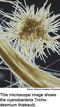 The winning images from this year and last year are also on display at the MIT Museum. You can also do the coursework to learn how to use the simulator and produce your own weird fields images. Here's a brief tour of other sites that display some of science's many beautiful and intriguing images: Science Magazine and the National Science Foundation's Science and Engineering Visualization Challenge The Wellcome Trust's Sciart 2004 MIT research scientist and photographer Felice Frankel The Science Photo Library Novartis Pharmaceuticals and The Daily Telegraph's Visions of Science contest Wednesday 4-13-05 Damage done There's more bad news on the human-damage-to-the-earth front. According to a study by the Millennium Ecosystem Assessment, humans have, in the past 50 years polluted or over-exploited two-thirds of the ecological systems life depends on, including air and water. The study, the most wide-ranging look at the planet's life-support systems to date, was coordinated by the United Nations Environment Programme, and carried out by 1,360 experts from organizations including United Nations agencies United Nations Foundation, United Nations Development Programme and United Nations Educational, Scientific and Cultural Organization, and the World Health Organization, the Smithsonian National Museum of Natural History, the Chinese Academy of Sciences, Stanford University, the University of Wisconsin, the University of Cambridge, and the University of Oxford. The damage is mostly due to human demand for food, fresh water, timber, fiber and fuel, and includes deforestation, nitrogen runoff, and global warming. The strain on earth's resources has sparked a substantial and largely irreversible loss in biological diversity and is responsible for triggering abrupt changes like the collapse of fisheries. The study pointed to changes that could limit the damage: changes in consumption patterns, better education, new technology and higher prices for exploiting ecosystems. The study estimated that many ecosystems retain more value if maintained. A wetland in Canada, for instance is worth $6,000 a hectare if it is able to support plants and animals, filter pollution, store water and act as a human recreation site. When converted to farmland the same hectare is worth $2,000. Similarly, a Thai mangrove worth $1,000 a hectare drops to $200 a hectare as a shrimp farm. Wednesday 4-6-05 Blue-green neurotoxin Here's
